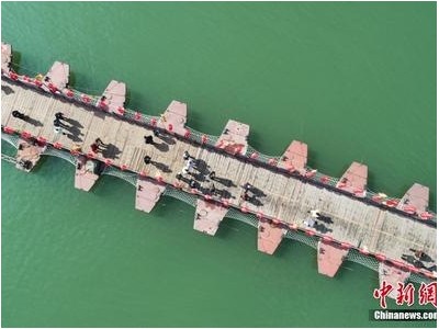 游客在阆中古城的嘉陵江 “福桥” 上步行观景。