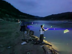 游客在升钟湖农家乐的餐桌前与美食自拍。